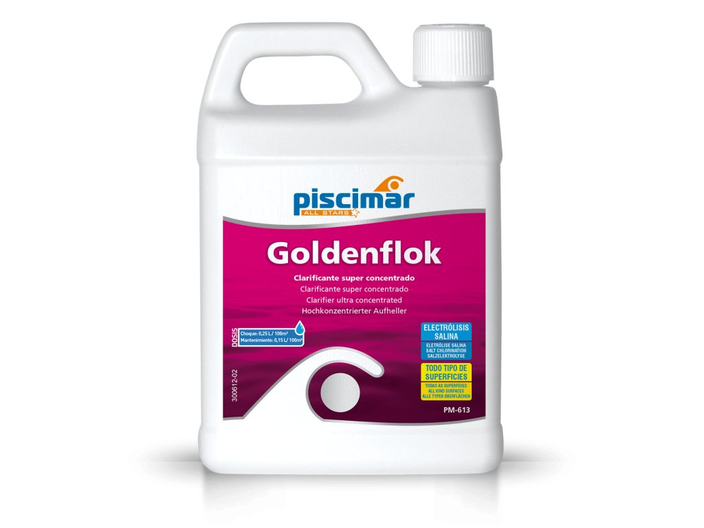 PM-613 Goldenflok je vysoce účinný koagulant a projasňovač navržený pro odstranění tuků, opalovacích olejů, organických látek, pylu a dalších nečistot z povrchu vody v bazénech. Díky procesu koagulace zvyšuje velikost částic, což umožňuje jejich snadnější zachycení filtračním systémem, aniž by se usazovaly na dně bazénu. Tento produkt také pomáhá předcházet tvorbě skvrn na linii hladiny a usnadňuje čištění.